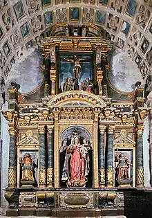 La hornacina principal se encuentra presidida por una talla barroca del siglo xvii[2] realizada en madera policromada la cual representa a Nuestra Señora de la Candelaria.[4] Esta imagen, ataviada con una túnica roja y una capa azul (ambas con estampación dorada), luce corona, un cirio en la mano derecha y al Niño Jesús en la mano izquierda, apoyándose en una peana decorada con las cabezas de tres serafines. A ambos lados de la hornacina central se encuentran dos tallas anónimas fechadas en el primer cuarto del siglo xviii[2] realizadas también en madera policromada, representando la de la izquierda a San Ramón Nonato, caracterizado por portar una custodia y una palma circundada por tres coronas, y la de la derecha al Arcángel Rafael, la cual se apoya en un bastón de peregrino del que cuelga una diminuta cantimplora, si bien carece del pez que debería llevar en su mano izquierda.