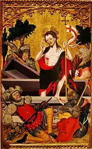 La escena recoge la visión triunfante de Cristo en la resurrección.[18] La figura central es Jesús que lleva el símbolo de la Santa Cruz y de la resurrección y hace una señal de bendición. Acaba de salir de la tumba después de que fuera abierta por el ángel enviado por Dios y que no aparece representado. El resto de personajes de la escena son los soldados que habían sido enviados por Pilatos para proteger el sepulcro y evitar que el cuerpo fuera robado. Los soldados visten diferentes tipo de armaduras medievales; caídos por el suelo, dormidos en posiciones casi imposibles. El rostro de Cristo tiene los rasgos propios de la mano del pintor Borrassa.[3][19]