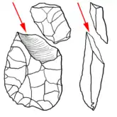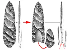 - Acanaladura de la base de algunas puntas de proyectil, o su adelgazamiento basal para facilitar su enmangue, son dos ejemplos de técnicas especiales con desechos característicos específicos de la edad de Piedra en América (por ejemplo, Folsom o, en el caso de la ilustración: Clovis).
