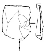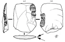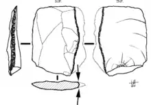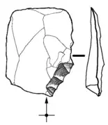 - Técnica del golpe de tranchet:[6] es una técnica observada a menudo en útiles bifaciales como hachas o bifaces. Se consigue dando un golpe cerca de uno de los bordes, lo que genera un negativo de lascado con un ángulo muy agudo respecto a la superficie golpeada, proporcionando un filo muy cortante a lo largo de la arista. En algunos casos, esta técnica busca el reavivado de un borde dañado. Aparentemente es una especie de variante del golpe de buril.