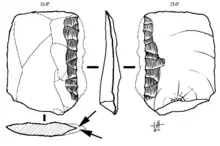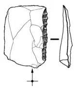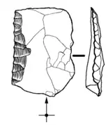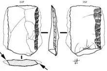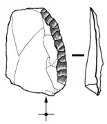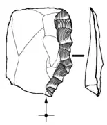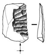 - Escaleriforme: es un tipo de retoque parecido al anterior, pero con las características más acentuadas, es decir, la forma es más ancha y terminan en un resalte abrupto, en escalera, generalmente aplicado sobre soportes gruesos. En determinadas circunstancias este tipo de retoque recibe el nombre de «Tipo Quina» por caracterizar a una de las facies del Musteriense europeo.
