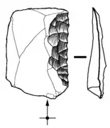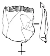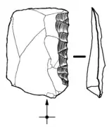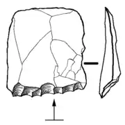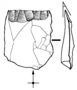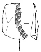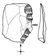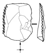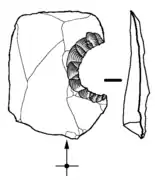 - En muesca: borde retocado con una zona claramente cóncava delimitada por dos ángulos laterales. Cuando la muesca se consigue con varios lascados contiguos, se habla de muesca retocada; si por el contrario, la escotadura se consigue por un único y profundo lascado, entonces se trata de un tipo especial, conocido como «Muesca Clactoniense» (ver más abajo).