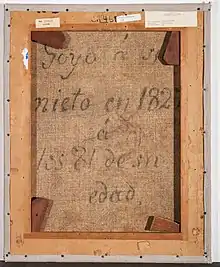 El artista a menudo firmaba y dedicaba sus últimos trabajos, y también señaló su edad con cierto orgullo. La inscripción Goya á su / nieto en. 1827, / á / los 81 de su / edad (Goya a su nieto en. 1827, a los 81 años de su edad) se encuentra en el reverso del cuadro [9]. Según Xavier Bray, no es del autor [11].