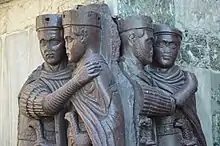 El Retrato de los cuatro tetrarcas representa a los cuatro gobernantes del Imperio instituido por el emperador Diocleciano, la primera Tetrarquía. [2] Nombró como coaugusto a Maximiano y eligieron a Galerio y Constancio I como sus césares; Constancio fue padre de Constantino el Grande. [3] Hay desacuerdo en cuanto a la identidad de estas estatuas y su ubicación, pero se sugiere que los gobernantes orientales forman un par y los gobernantes occidentales forman el otro par, cada uno con un 'augusto' mayor y el 'césar' menor. [4] Otra posibilidad menos probable es que los dos augustos estén representados en una pareja y los dos césares en la otra. Una tercera teoría más antigua es que representasen un grupo dinástico de la dinastía constantiniana.