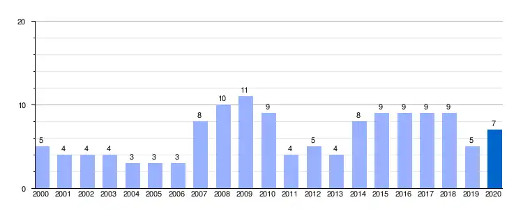 Gráfica de evolución demográfica de Revilla de Campos entre 2000 y 2020 |