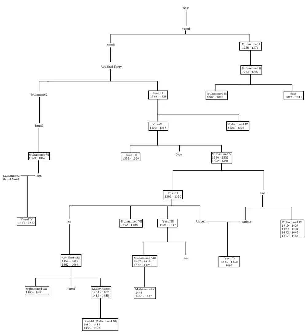 ![]() | Yúsuf V | Sobrino de Muhámmad IX | ¿? | 1445 | 1446 | 1462 | Sultán |