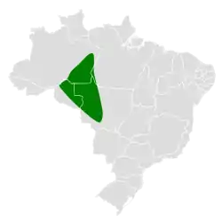 Se distribuye en el centro de la Amazonia brasileña, desde la margen oriental del bajo río Madeira hacia el sur a través de Rondônia hasta el oeste de Mato Grosso.[4]
