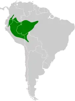 Se distribuye por la base de los Andes desde el centro sur de Colombia hacia el sur por el este de Ecuador, este de Perú, hasta el noroeste de Bolivia y hacia el este hasta el centro de la Amazonia brasileña.[5] Ver más detalles en Subespecies.