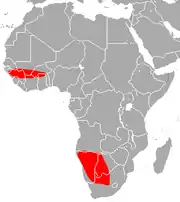 Se encuentra en Angola, Botsuana, Ghana, Guinea, Guinea Bissau, Namibia, Sudáfrica y Zimbabue.
