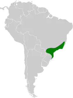 Se distribuye en el litoral del sureste de Brasil desde el sur de Bahía hacia el sur hasta Santa Catarina y norte de Río Grande do Sul, extendiéndose hacia el interior en el sur hasta el oeste de Paraná.[7]