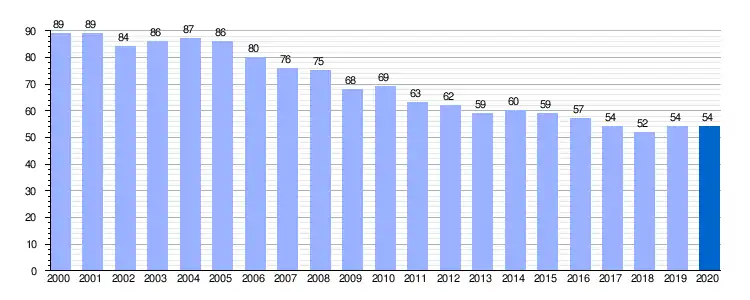 Gráfica de evolución demográfica de Riberos de la Cueza entre 2000 y 2020 |