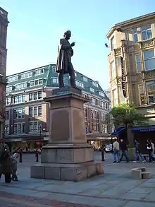 La estatua de Cobden en el centro de la ciudad de Stockport se trasladó en 2006 como parte de un plan de regeneración urbana, pero ahora está de nuevo en su lugar.