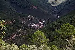Su arquitectura corresponde a la típica construcción hurdana compuesta de pizarra y piedra. En sí es un conjunto de "arquitectura negra", el mejor conservado de la comarca de Las Hurdes. Con casas construidas de pizarra y con techos de "lanchas" que le confieren un singular aspecto. Entre las construcciones destaca su iglesia Parroquial.