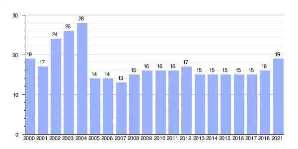 Gráfica de evolución demográfica de Riomaior entre 2000 y 2021 |