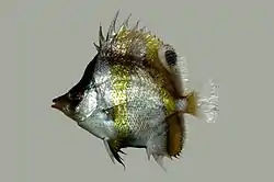 De cuerpo alto, comprimido lateralmente, y con la boca en forma de tubo. Su coloración es blanca en todo el cuerpo, y presenta tres franjas marrones a ocres, verticales, de distinto grosor. De más estrecha en la cabeza, y atravesando el ojo, a más gruesas las del cuerpo, aunque menos anchas que las de otras especies del género. La segunda recorre desde la cuarta y quinta espinas dorsales, estrechándose gradualmente y ensanchándose hacia el vientre, incluyendo esta tonalidad marrón a las aletas pélvicas, excepto su margen anterior, que es blanco. La tercera franja tiene medio ocelo negro, contorneado por medio anillo blanco, entre el segundo y séptimo radios blandos de la aleta dorsal. La combinación de la raya cubriendo el ojo, junto al ocelo en la parte opuesta a la cabeza, es una estrategia defensiva generalizada en la familia. Las aletas pectorales y la caudal son transparentes, contando esta última con una franja vertical en su base, del color de las otras franjas del cuerpo.