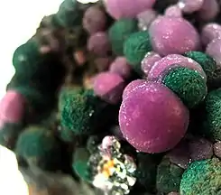 ![]() Rockbridgeita (esférulas de color verde) con Strengite (esférulas rosas). Mina Leveäniemi, Svappavaara, Kiruna, Laponia, Suecia. | ||