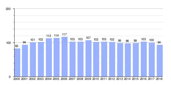 Gráfica de evolución demográfica de Rois (aldea) entre 2000 y 2018 |
