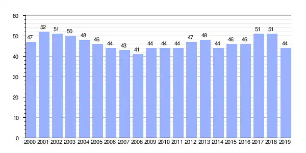 Gráfica de evolución demográfica de Rois (aldea) entre 2000 y 2019 |