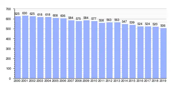 Gráfica de evolución demográfica de Rois (parroquia) entre 2000 y 2019 |