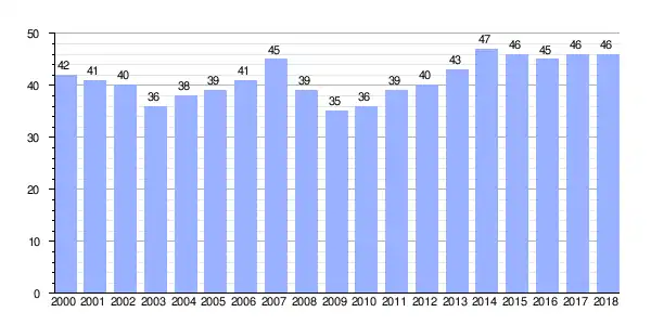 Gráfica de evolución demográfica de Romarís entre 2000 y 2018 |