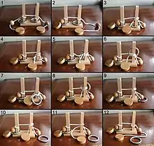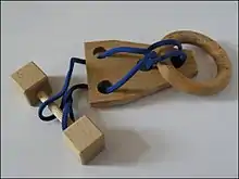 Los rompecabezas topológicos (también llamados rompecabezas de enmarañamiento o rompecabezas de enredo)[1] son un tipo o grupo de rompecabezas mecánicos que implican desenmarañar una pieza o conjunto de piezas de otra pieza o conjunto de piezas. En esta categoría se incluyen varios subtipos, cuyos nombres a veces se utilizan como sinónimos para el grupo: rompecabezas de alambre; rompecabezas de uñas; rompecabezas de anillos y cuerdas; et al.[2][3] Aunque el objetivo inicial es desenredarlo, el problema inverso de volver a armar el rompecabezas puede ser tan difícil como, o incluso más difícil, que desenredarlo. Hay varios tipos diferentes de rompecabezas de desenredo, aunque un solo rompecabezas puede incorporar varias de estas características.