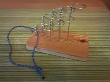 - Subgrupo de cuerdas fijas sin cerrar: las piezas de cuerda no están cerradas, pero están en algún lugar de su longitud unidas al cable. En estos rompecabezas, la cuerda no debe desenredarse del alambre. Una posible tarea puede ser mover un anillo o una bola de un extremo de la cuerda a otro.