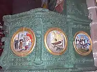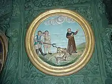 Escenas de la vida de Ronan en el púlpito policromado de la iglesia parroquial de Locronan. Una escena retrata el episodio en el que Keban acusó al santo de licantropía .