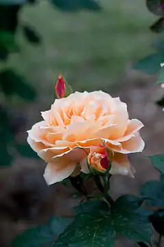 Las hojas son de color verde oscuro y brillante.[1] Sus delicadas flores de color albaricoque o mezcla de albaricoque a naranja. Diámetro medio de 4". La forma de floración es de flores grandes, dobles (17 a 25 pétalos).