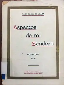 Su primera obra "Aspectos de mi sendero" fue dedicada a su padre, en su ofrenda escribió "A tu ilustre y sagrada memoria de padre y de poeta, dedico este querido libro mío que ha florecido en mis horas de angustia y en mis horas de ensueño". Esta obra contiene tres partes, en las cuales reúne una selección de diversos versos (poesía), prosas y conferencias; las mismas que fueron inspiradas con momentos de su vida. En la primera parte se enfoca en versos, entre los cuales están: "Desolación", "Mis hijos", "A mi esposo Ausente", "La Mujer del Trópico", entre otros. Por otro lado en la segunda parte se encuentran cuatro prosas: "Bosquejo", "Visión Lejana", "Los Ciegos" y "Del Azar de la Vida" (Diálogo). Finalmente en su tercera parte se detallan tres conferencias: “Elogio de San Francisco de Asís”, “Influencia de la mujer como factor importante en el mejoramiento humano” y “La Mujer Moderna y la Obrera”.[18]
