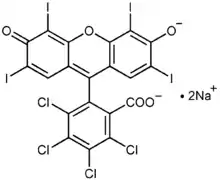 La Rosa de bengala (4,5,6,7-tetracloro-2',4',5',7'tetrayodofluoresceína) es un colorante del grupo de los xantenos.[2] Sus sales de sodio se utilizan de manera común en gotas oftálmicas para señalar células conjuntivas y de la córnea, dañadas y por lo tanto, identificar el daño ocular. También es utilizado en la preparación de Foraminifera para análisis microscópicos, permitiendo la distinción entre aquellas células que estaban vivas o muertas al momento de su recolección.