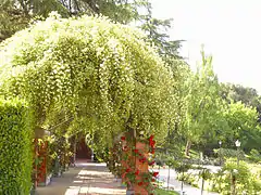 - Rosal Banksiae 'Lutea' rampante y trepadores en la pérgola lateral.