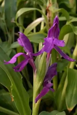 En su hábitat natural, florece entre junio y agosto. El pedúnculo de vara de la flor puede se ocultó o sobresaltado por las vainas de las hojas. Una a tres flores se abren juntas, y pueden tener diferentes colores como el morado, rojo o blanco. Las brácteas que subtienden flores tienen de 3,5 a 5,5 cm de longitud, major que el cáliz.[3]