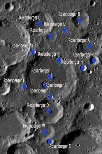 Rosenberger es un antiguo cráter de impacto situado en la parte sureste de la Luna. Debido al escorzo, aparece ovalado cuando se ve desde la Tierra, efecto que desaparece desde las naves en órbita, que muestran que el borde del cráter es casi circular.