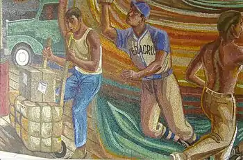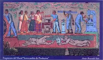 Hacia 1953 ejecuta en la Secretaría de Comunicaciones y Transportes, el mural registrado con los nombres de “Intercambio de productos” o “Campesinos y Obreros”, hecho con piedra policroma natural, no se dañó con el sismo de 1985, pero si presenta en la actualidad deterioro, que se considera necesario restaurar.
