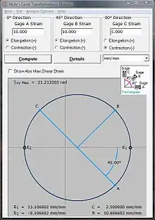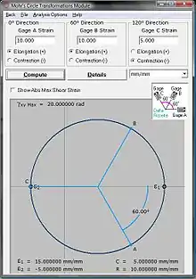 Cuando la roseta está instalada en una superficie de prueba sometida a un estado de deformación arbitraria, las variables y son desconocidas, Pero las deformaciones , y se puede medir. De este modo, , y , las deformaciones principales y el ángulo pueden ser expresados en términos de las tres medidas de deformación así: