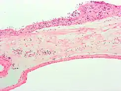 ![]() Micrografía de una corioamnionitis caracterizada por infiltrado granulocítico (puntos violeta), uno de los factores de riesgo para una ruptura prematura de membranas ovulares. | ||