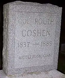 Fue originalmente enterrado sin lápida por temor a que su cuerpo fuera desenterrado y su esqueleto puesto en exhibición. El cementerio es el Cedar Grove Cemetery en Middlebush, Nueva Jersey. En su lápida colocada posteriormente se lee "Col. Routh Goshen, Middlebush Gigant, 1837-1889".[20]