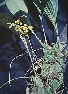 La inflorescencia en racimo, largo, abierto, de 20 cm de largo, lateral, muy laxa, con varias [7 a 15] flores y que surge de la base de pseudobulbos. Puede tener un número de flores, de tamaño medio o pequeño, pero vistosas, generalmente con sépalos y pétalos manchados, y que tienen labio profundamente trilobado con un disco o callo verrugoso , y los lóbulos laterales en posición vertical, la columna y cuatro polinias en dos pares.