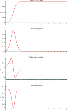 La figura muestra los movimientos curvas para cuatro ranuras externas en la rueda de Ginebra, en unidades arbitrarias. Hay una discontinuidad en la aceleración cuando el pasador de la rueda entra y sale de la ranura. Esto genera un pico “infinito” de tirones (pico Dirac), y por lo tanto vibraciones.