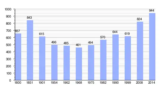Los datos demográficos contemplados en este gráfico de la comuna de Ruillé-le-Gravelais[4] se han cogido de 1800 a 1999 de la página francesa EHESS/Cassini, y los demás datos de la página del INSEE.[5]