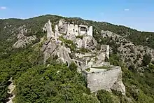 La ruina del castillo Dürnstein se encuentra en la Wachau (un valle del Danubio),sobre el pueblo de Dürnstein en Baja Austria, Austria .