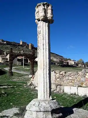 - Vista occidental del crucero de la ermita de la Cruz en Moya (Cuenca), con detalle del capitel.