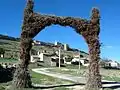 - Vista oriental de las ruinas de Moya (Cuenca), con detalle del arco de bienvenida a la Virgen de Tejeda en las fiestas del Septenario.