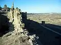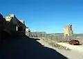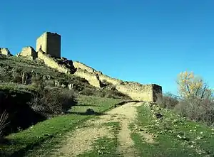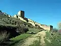 - Vista meridional de La Coracha del castillo de Moya (Cuenca), con detalle de la torre de San Roque en la parte alta. Siglo XIV.