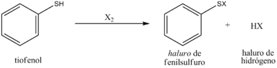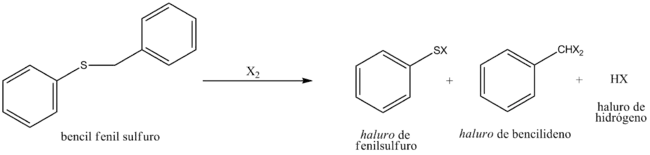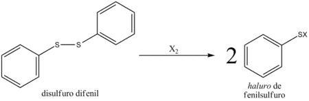 La reacción se produce en disulfuros de diarilo, tiofenoles y aril bencil sulfuros. La ruptura del compuesto sulfurado se produce con dicloro (Cl2) o dibromo (Br2).[2][3][4][5][6]