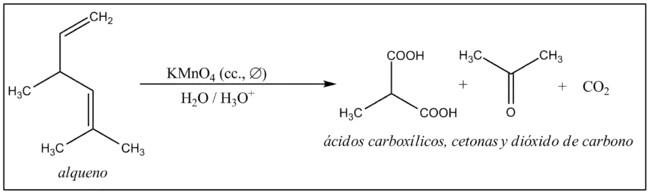 La ruptura oxidante con permanganato se produce cuando el alqueno reacciona con una solución ácida o neutra concentrada de permanganato a altas temperaturas.[1] Como resultado de la reacción se oxidan totalmente los dobles enlaces carbono-carbono de la molécula, pudiendo formarse ácidos carboxílicos, cetonas y dióxido de carbono como productos de la reacción.[1]