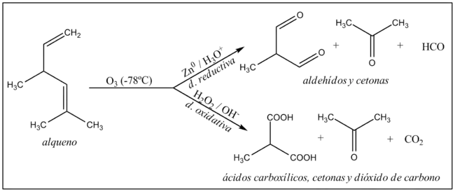 La ruptura oxidante por ozonólisis ocurre cuando un alqueno reacciona con ozono a bajas temperaturas formando un ozónido y luego es roto por descomposición reductora o descomposición oxidante.