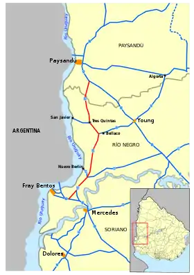 - Oeste: a Fray Bentos y Puente Internacional "Libertador General San Martín" conexión con RN 136 en Argentina