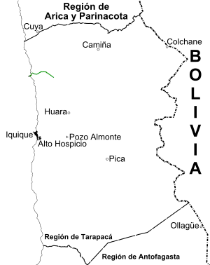 - Provincia del Tamarugal: acceso a ex-salitrera San Antonio de Zapiga (km 2), Pisagua (km 40).