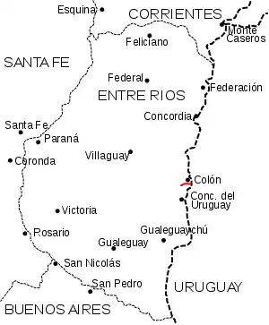 • oeste | RN 14 cerca de Colón (32°15′39.7″S 58°14′17.9″O) | ||||||||